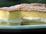 Put half the cake in a 9 by 13-inch plastic keeper. Spread all of filling over that, then top with the other half of the cake. Cover with lid and store 1 or 2 days ahead. Garnish with powdered sugar and mint before serving.