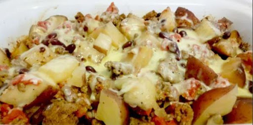 1. While the ground beef is browning, place potatoes in bottom of slow cooker, and salt and pepper generously.