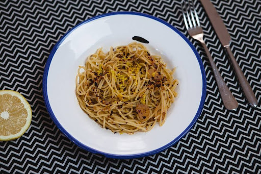 Add pasta and its reserved water to onion-garlic mixture, place pan over medium heat, and toss to coat spaghetti. Off heat, add lemon zest and a few squeezes of lemon juice, tossing pasta again to incorporate. Taste and add more lemon juice as needed. Season with sea salt to taste. Serve immediately.