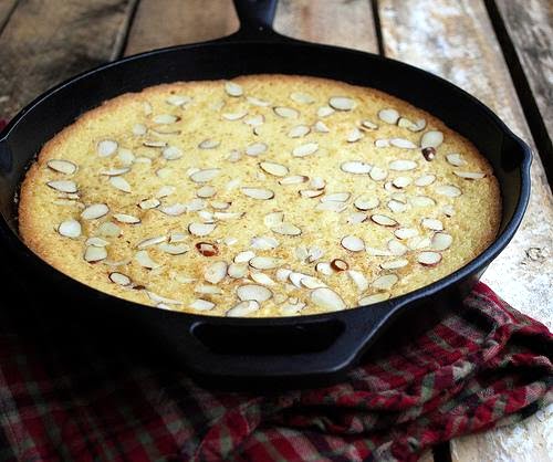 Scrape the batter into the pan and smooth the top with a rubber spatula. Scatter the sliced almonds over the top and sprinkle with a little sugar (I used Demerara sugar for a little more rustic look). If you're using a cake or pie pan, place the pan on a baking sheet.
