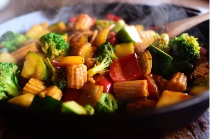 Heat the oil in a large skillet over medium-high heat. Add the onion and peppers, and stir, cooking for 2 to 3 minutes. Add the garlic and cook for 30 seconds to 1 minute more, stirring continuously. Add the zucchini and stir it around, cooking it for 2 minutes more. Add the baby corn and broccoli and cook for a couple of minutes, then, while the veggies are still firm, pour in the sauce.