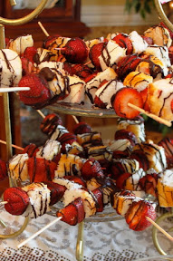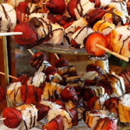 Cut up cake in small cubes and alternate strawberries dipped in different chocolates. Drizzle with additional chocolate if desired. Stack on plate. Add fruits like pineapple or berries for variety.