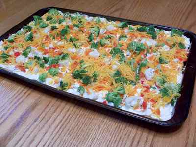 Blend together cream cheese, mayonnaise, dry soup mix. Place on top of roll mix. Top with chopped vegetables.