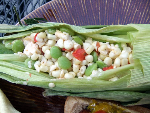 3. Preheat oven to 425 degrees. Remove husk and string from water. Shake excess water from husk. Carefully place about 1 cup succotash mixture in each husk.