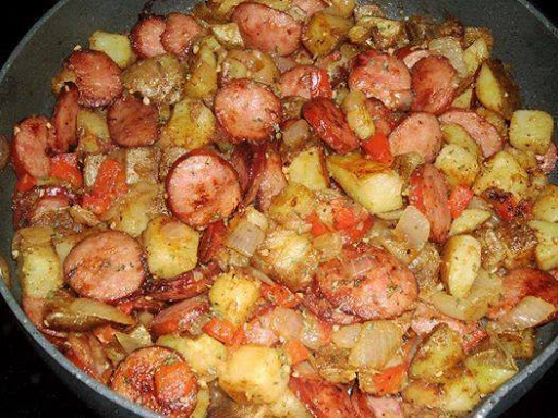 In a large skillet heat oil...add in the Kielbasa and cook, turning often till browned on edges. Remove meat from skillet and add in the potatoes and cook over med. high heat till they begin to brown and become tender. Add in the onions, pepper and garlic cooking for about 5 minutes then add in the chicken stock and cover. Cook for about 5-6 minutes, stirring occasionally. Remove cover and check potatoes for doneness. Add the spices, stir and add in the kielbasa.