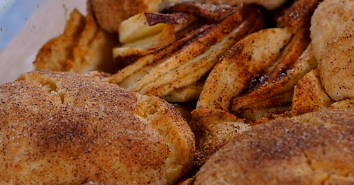 Roll each ball in sugar mixture until completely coated, then place cookies evenly on top of apples.