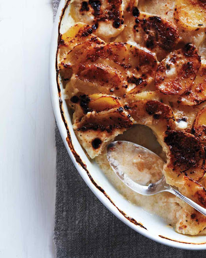 Preheat oven to 375 degrees. Rub the bottom and sides of a 3-quart baking dish with garlic; reserve garlic. Brush pan generously with butter. Peel potatoes, then cut into 1/8-inch-thick rounds.