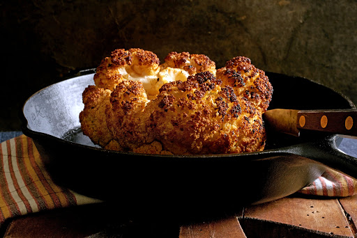 Heat the oven while you prepare the cauliflower: Place a heavy oven-proof skillet (a cast-iron skillet looks very nice) or a baking sheet in the oven and turn the heat to 375 degrees. Place a small pan of hot water on the floor of the oven, to create steam.