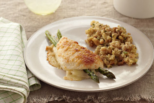 Make cut in one long side of each chicken breast, being careful to not cut through to opposite side. Fill pockets with asparagus and shredded cheese.