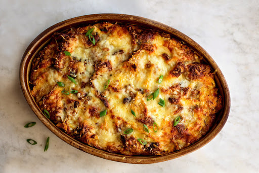 When you’re ready to bake the casserole, heat oven to 350 degrees. Scatter the remaining grated cheese over the top of the casserole. Transfer to oven and bake until casserole is golden brown and firm to the touch, 45 minutes. Let stand 10 minutes. Garnish with sliced scallion tops before serving.
