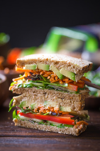 Spread hummus on top of two slices of bread. Top with micro greens, cucumber, red pepper, avocado, carrots and lettuce.