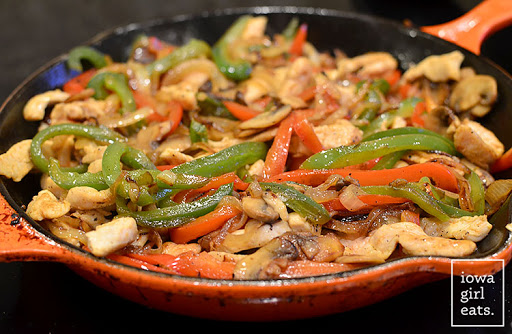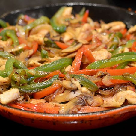 The The Best Chicken Fajitas ever feature sautéed bell peppers, onions, and mushrooms--oh, yum! The paprika and cumin lend a nice smokey flavor to the dish. The recipe feeds a crowd and is best served with your favorite refried bean recipe or over a lightly dressed salad. This recipe can be served the traditional way in a the type of tortillas of your choice with sour cream, salsa, and guacamole.