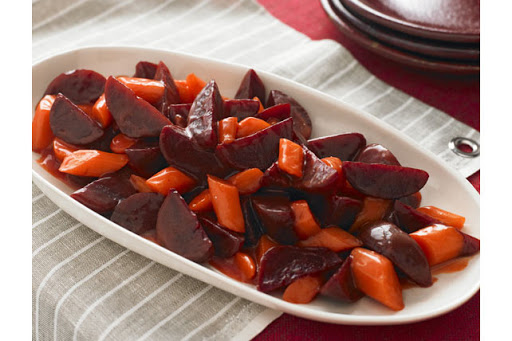 Unwrap beets; remove and discard skins and stems. Cut each beet into 8 wedges. Add to carrots along with combined dressing and ginger; toss to coat. Bake 10 to 15 min. or until vegetables are tender.