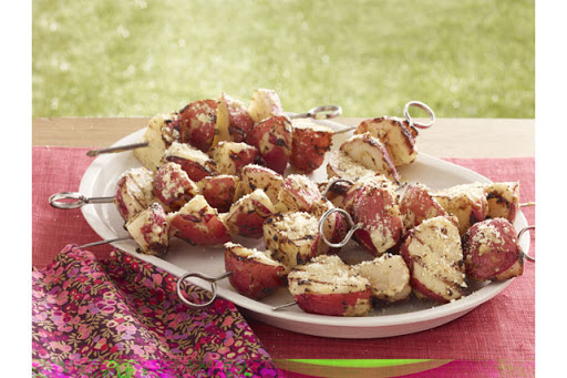 Heat greased barbecue to medium heat. Thread potatoes onto 8 small metal skewers; brush with dressing mixture remaining in bowl. Grill 8 to 10 min. or until potatoes are tender and golden brown, turning after 5 min. Transfer to platter; sprinkle with cheese.
