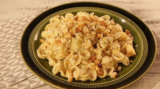 Add the cauliflower florets, garlic, red pepper flakes and 1/2 cup of pasta water and bring to a simmer over medium-high heat, then reduce the heat to a gentle simmer, cover and cook, stirring occasionally, until the cauliflower is very soft and almost falling apart, about 22 to 25 minutes. Add a drizzle of olive oil and season to taste with salt and pepper.