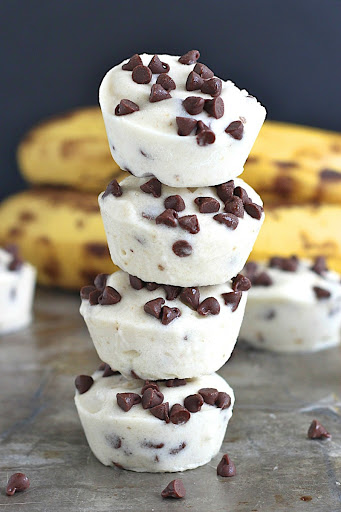 Grease a mini muffin pan with non-stick cooking spray. Scoop the banana ice cream into each cup, filling each one almost full, then sprinkle the top of each cup with a few more mini chocolate chips. Place the muffin pan in the freezer for an hour.