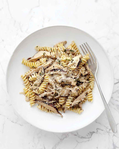 Meanwhile, in a large skillet, melt butter over medium-high. Add shallots and garlic and cook, stirring, until shallots are translucent, about 5 minutes. Add mushrooms and thyme and cook until mushrooms are tender, about 2 minutes. Add wine and cook until liquid is reduced by half, about 2 minutes. Reduce heat to low, stir in cream, and cook until warmed (do not let boil). Season with salt and pepper. Add pasta to skillet, toss to combine, and top with Parmesan.