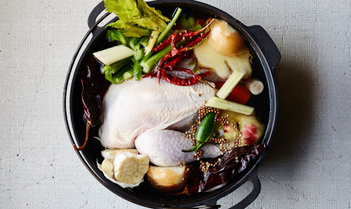 Place chicken, celery, onion, cilantro, carrots, lemongrass, chiles de árbol, guajillo chiles, jalapeños, garlic, ginger, bay leaves, and coriander in a large stockpot. Add cold water to cover, then bring to a boil over medium heat. Reduce heat and simmer, occasionally skimming fat and foam from surface, 30 minutes. Transfer chicken to a rimmed baking sheet; simmer stock 30 minutes longer.