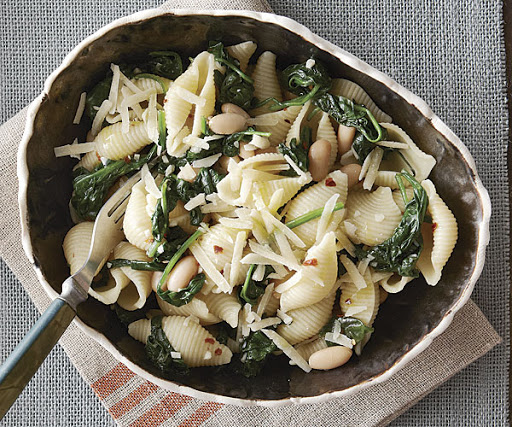 3. Boil the pasta according to package directions until al dente. Reserve 1/2 cup of the pasta water, then drain the pasta. Return the pasta to the pot and toss with the spinach-bean mixture, the remaining 1 Tbs. oil, and the lemon juice. Add a little of the pasta water to moisten, if necessary. Season to taste with salt and lemon juice. Serve drizzled with more oil and topped with grated cheese.