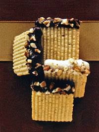 You'll need a cookie press with a ribbon disk to shape these ridged wafer-like cookies. Chopped pecans are stirred into the cookie dough and sprinkled on the chocolate glaze.