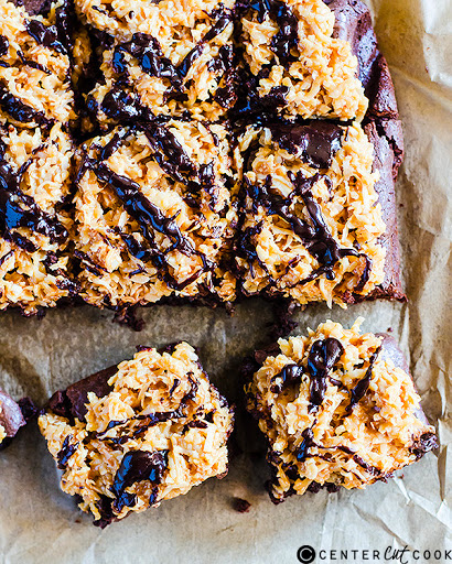 You may optionally add a chocolate drizzle over the coconut for a more authentic Samoa cookie look. (personally, I preferred the brownies without the drizzle!)