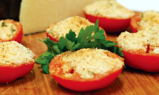 2. Mix cheese and all other ingredients together and place on top of tomatoes.