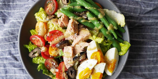 Whisk oil, mustard, vinegar, and a pinch each of salt and pepper in a large bowl. Add romaine and toss to combine. Divide between serving bowls and top with tuna, tomatoes, olives, green beans, and eggs, dividing evenly.