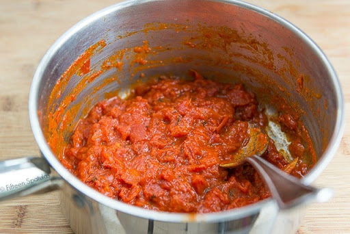 Place the pan over medium heat and bring to a simmer. Let this cook, uncovered, for 45 minutes, turning down the heat as needed. I have a gas stove that runs pretty hot, so about 15 minutes in I turn it down to medium low, otherwise the sauce sputters too much.