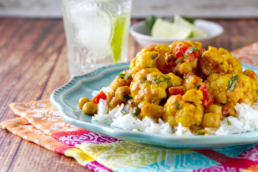 Add two tablespoons canola oil to a large skillet and heat over medium high heat. Add the onions and saute until golden, about 8 minutes. Sprinkle the curry powder over and stir for about 30 seconds - you should be able to smell the spices! Add the cauliflower and stir. Add in the tomatoes, coconut milk and garbanzo beans. Stir to combine. Bring the mixture to a boil and then reduce to a simmer. Cover and simmer for about 15 minutes, until the mixture has thickened slightly and the the cauliflower is tender. Remove the lid and taste, adding additional salt, pepper and cayenne pepper as needed.