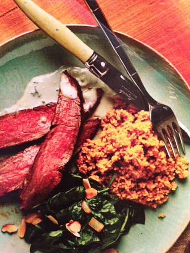 Chipotle-Rubbed flank steak with couscous + spinach with toasted almonds