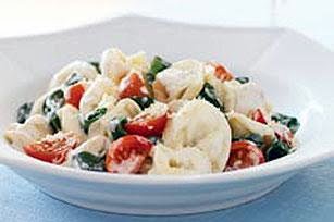 DRAIN pasta. Add to spinach mixture; mix lightly. Top with tomatoes and remaining Parmesan.