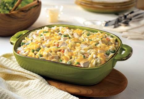 Heat the oven to 400°F. Stir the soup, milk, vegetables, chicken, noodles, Parmesan cheese and black pepper in a 1 1/2-quart casserole.