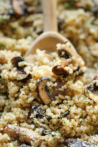 •Heat olive oil in a large skillet over medium high heat. Add mushrooms, garlic and thyme, and cook, stirring occasionally, until tender, about 3-4 minutes; season with salt and pepper, to taste. Stir in quinoa until well combined.