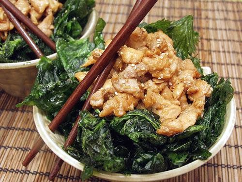 Arrange spinach on top of rice, and pile chicken in the centre. Garnish with sesame seeds and serve.