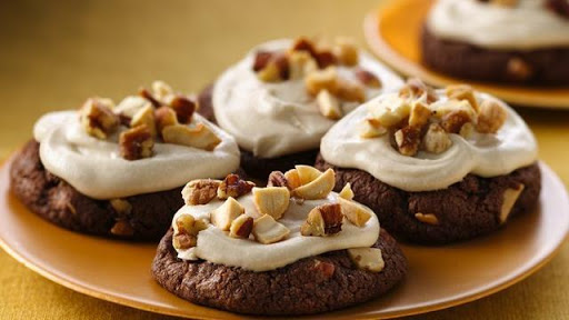 Frost cooled cookies; sprinkle with remaining 1/2 cup nuts. Store loosely covered.