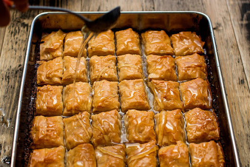 11. Remove pan from oven and place in the sink or on a rimmed baking sheet to catch any drips of syrup. Slowly pour hot sugar syrup over the pastry; it will bubble up and some may overflow. When the syrup stops bubbling, move pan to wire rack to cool completely. Serve at room temperature.