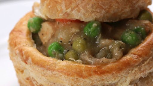 Take the puff pastry shell, use a knife to remove the top, fill with the chicken pot pie filling, put the top back on. Enjoy!