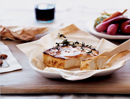 1. Preheat the oven to 400 degrees. Select a small oven-to-table earthenware dish or a small ovenproof sauté pan lined with aluminum foil to help transfer the cheese to a plate after roasting. Place the feta in the dish and cover with the olive oil. Bake until the cheese is soft and springy to the touch but not melted, about 8 minutes.