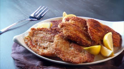 Put the breadcrumbs on a large plate and mix in the salt and pepper. One by one remove the chicken breasts from the eggs and lightly coat both sides in the breadcrumbs. Place the pieces on a rack while you continue with the remaining chicken breasts.