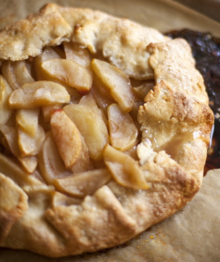This is a rustic French tart with a rather fanciful name, galette, but at the end of the day it is just a pie without a plate. It is simple to make and imperfection is part of its old world charm. No fancy fluting or lattice top crust to worry about and yet the flavor is just as wonderful. A galette can be made with any filling, but right now the apples are abundant and calling me. Since there are so many varieties of apples available, I like to use a few to create the filling. Some will turn to sauce (McIntosh), some will keep their shape (Prairie Spy), others will be sweet (HoneyCrisp) and some will be tart (Haralson). You can mix and match to suit your mood. The crust should be tender and flaky and just barely strong enough to hold up to the apples. It adds to the drama if some of the juices escape, which is why we bake on a sided baking sheet.