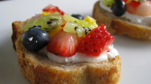 In a bowl, combine mascarpone and honey. Spread a tablespoon on each baguette. Top with an assortment of chopped fruit.