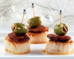 3. Near to serving, spear each olive, including clinging shallot mixture, onto a toothpick; push olive up pick to allow room for scallop and sausage. Spear a sausage slice onto each toothpick.