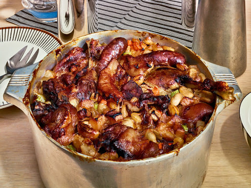 Increase oven heat to 450, and cook until the beans are bubbling and crusted around the edges and the meats are deeply crisp on top (about 10-15 minutes). Let rest 10 minutes or so before serving.