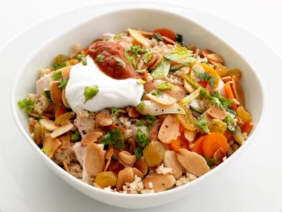 3. Uncover the vegetables and stir in the chicken and raisins. Continue cooking over medium-high heat until the raisins are plump about 5 minutes. Stir in the honey and remaining 1/4 cup of cilantro. Serve over couscous; top with almonds.
