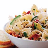 Cook pasta according to pkg directions and drain. Meanwhile, in a large bowl combine the avocados, bacon, basil, lemon juice, olive oil, garlic, pepper and salt. Add the hot pasta and toss to combine. Transfer to bowl, sprinkle with cheese.