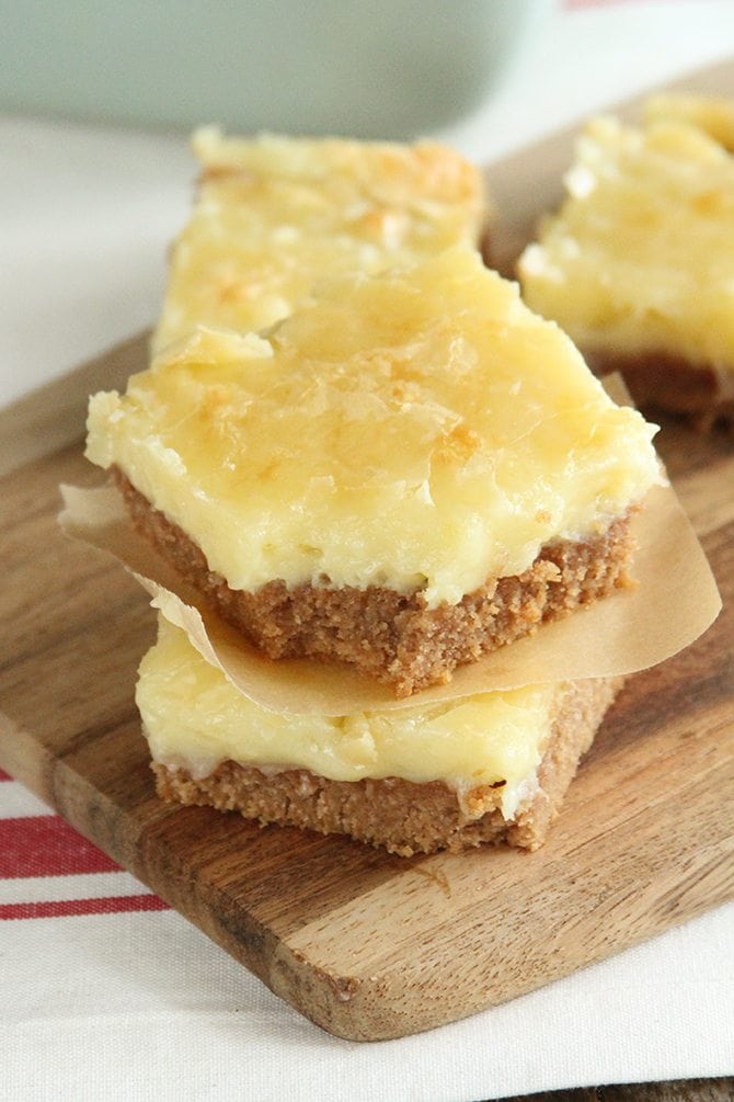 Bake for 40 to 50 minutes or until the edges are just firm but the middle is still jiggly. Cool completely before slicing into squares.
