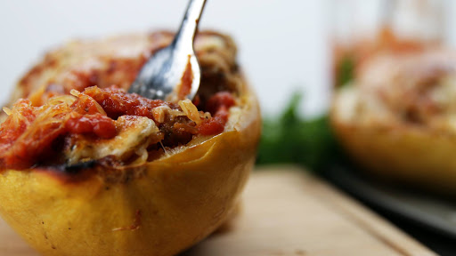 Once the squash has finished roasting - remove from the oven and let it set for a few minutes before turing over and pulling at it with a fork. Shred the inside of each squash, being careful not to poke through the skin. Pour marinara sauce over shredded squash. Top with chicken strips, then more marinara, and finish with mozzarella and parmesan cheese, and a pinch of Italian seasoning. Return to the oven to bake for 10-15 minutes until the cheese has melted. Enjoy!