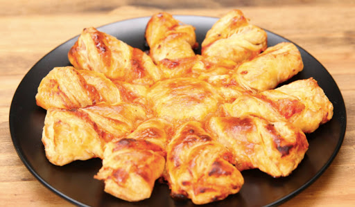 Place the two sheets of puff pastry on a parchment paper lined baking tray. Cut out equal size circles. Remove the top sheet. On the bottom sheet, spread pizza sauce and shredded cheese. Place the other sheet of puff pastry on top. Take a glass and place it in the center of the circle. Using a knife or scissors, cut strips away from the edge of the glass. Take each strip and twist. Brush egg wash over the top of the puff pastry. Bake at 400°F/204°C for 20-25 minutes. Enjoy!