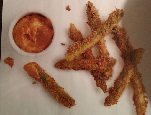 Put the flour on a small plate, and season generously with salt and pepper. Put the panko on another small plate. Dredge the asparagus spears in the flour, then the egg mixture and then the panko. Deep fry and sprinkle with salt.