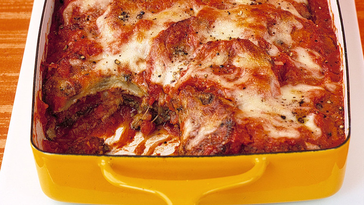 2. Dip eggplant slices in egg mixture, letting excess drip off, then dredge in breadcrumb mixture, coating well; place on baking sheets. Bake until golden brown on bottom, 20 to 25 minutes. Turn slices; continue baking until browned on the other side, 20 to 25 minutes more. Remove from oven; raise oven heat to 400 degrees.